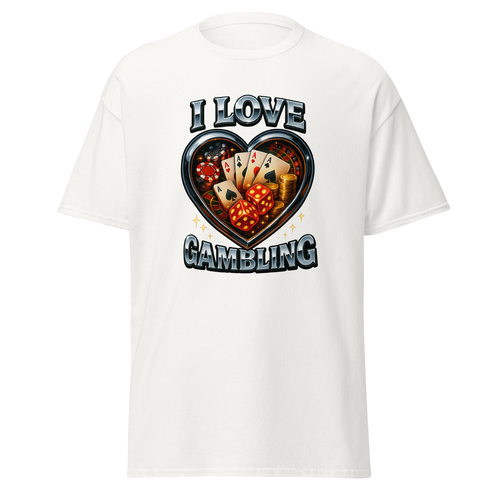 Mit dem „I Love Gambling“-T-Shirt bringst du dein Pokerface direkt auf die Straße. Das auffällige Motiv im Herz-Design zeigt alles, was den Nervenkitzel ausmacht: Asse, Würfel, Chips und Goldmünzen. Perfekt für alle, die das Risiko lieben oder einfach ihren Humor mit einem Augenzwinkern präsentieren wollen.