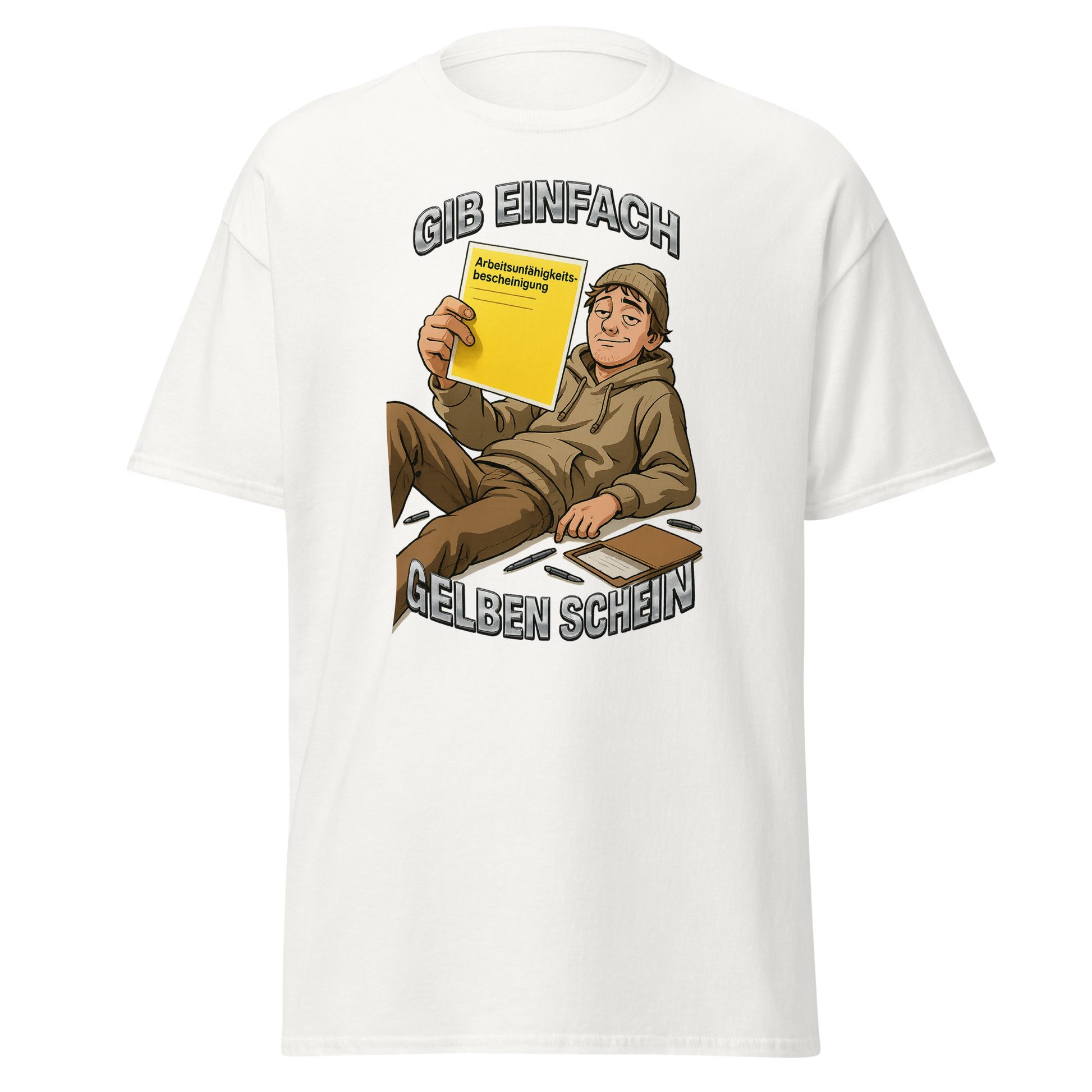 Das „Gib einfach gelben Schein“-T-Shirt ist die ultimative Hommage an die klassische Lösung, wenn mal wieder nichts geht: Krankmelden! Das Motiv zeigt einen entspannten Typen, der locker die Arbeitsunfähigkeitsbescheinigung hochhält, während der Rest der Welt schuften muss. Ein perfektes Shirt für alle, die mit Humor auf das Thema Krankenstand und Fehltage blicken.